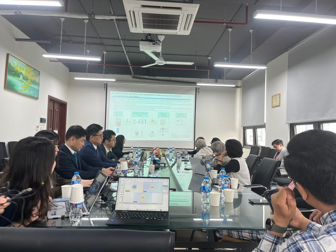 Mở đầu, TS.Tạ Quang Ngọc cảm ơn phía Nhật Bản đã tổ chức buổi gặp mặt hôm nay và giúp Việt Nam trong việc quản lý, thu hồi, tiêu hủy và tái chế môi chất lạnh. Đại diện Bộ Môi trường Nhật Bản đã giới thiệu các chính sách lớn của Nhật Bản và nêu phương hướng hợp tác giữa Bộ Môi trường Nhật Bản và Hội KHKT Lạnh và Điều hòa không khí Việt Nam. Tập đoàn Daikin đang thực hiện dự án với Bộ Môi trường Nhật Bản xây dựng mô hình kinh tế tuần hoàn Floruacacbon thu gom, tái chế và tiêu hủy Floruacacbon dùng trong điều hòa không khí thương mại ở Việt Nam. Trung tâm Hợp tác Môi trường Quốc tế, Nhật Bản và Hãng điều hòa Daikin đã báo cáo tình hình thực tiễn ở Việt Nam về các vấn đề trên, nêu lên những nhu cầu, khó khăn, thuận lợi.