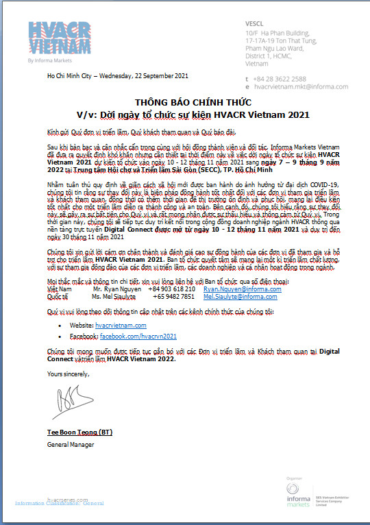 Sau khi bàn bạc và cân nhắc cẩn trọng cùng với hội đồng thành viên và đối tác, Informa Markets Vietnam đã đưa ra quyết định khó khăn nhưng cần thiết tại thời điểm này về việc dời ngày tổ chức sự kiện HVACR Vietnam 2021 dự kiến tổ chức vào ngày 10 - 12 tháng 11 năm 2021 sang ngày 7 – 9 tháng 9 năm 2022 tại Trung tâm Hội chợ và Triển lãm Sài Gòn (SECC), TP. Hồ Chí Minh.