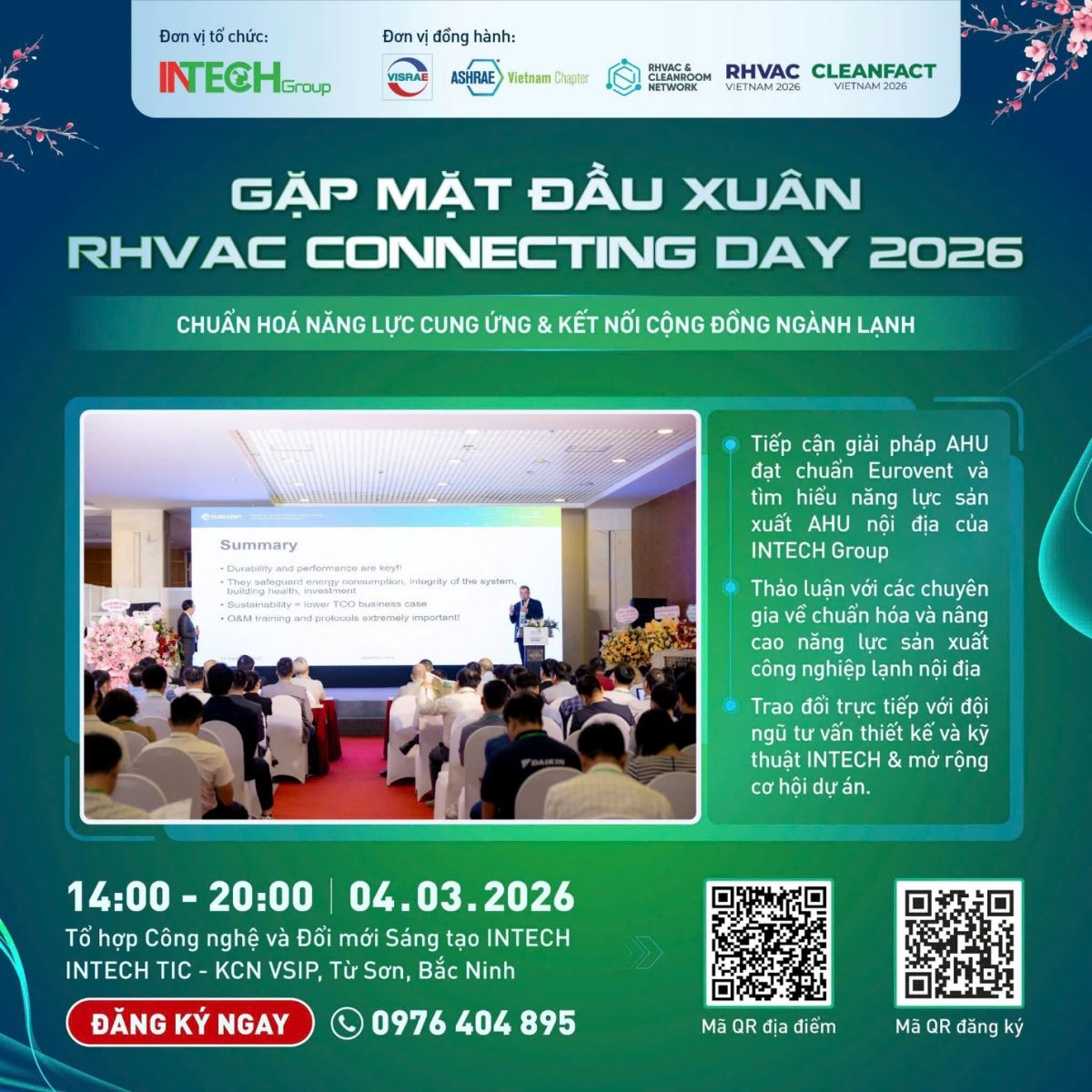 🤝 Hội KHKT Lạnh và Điều hòa không khí Việt Nam (VISRAE) phối hợp tổ chức sự kiện “Gặp mặt Đầu Xuân - RHVAC Connecting Day 2026” với INTECH Group tổ chức, cùng sự góp mặt của ASHRAE Vietnam Chapter và RHVAC & Cleanroom Network, dưới sự phối hợp truyền thông của Ban Tổ chức chuỗi sự kiện Cleanfact & RHVAC Vietnam.